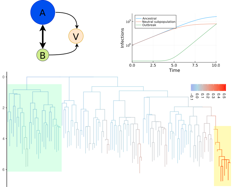 • One limitation of this approach is that it depends on the ability to estimate high-quality time-scaled phylogenies. This isn’t always possible; sometimes we deal with short and incomplete genomic data, and the best we can do is identify clusters. The good news is that the basic underlying model for cod’s could be used in this case as well. Showing how to do this will be very useful for applying these methods to new metagenomics surveillance systems.